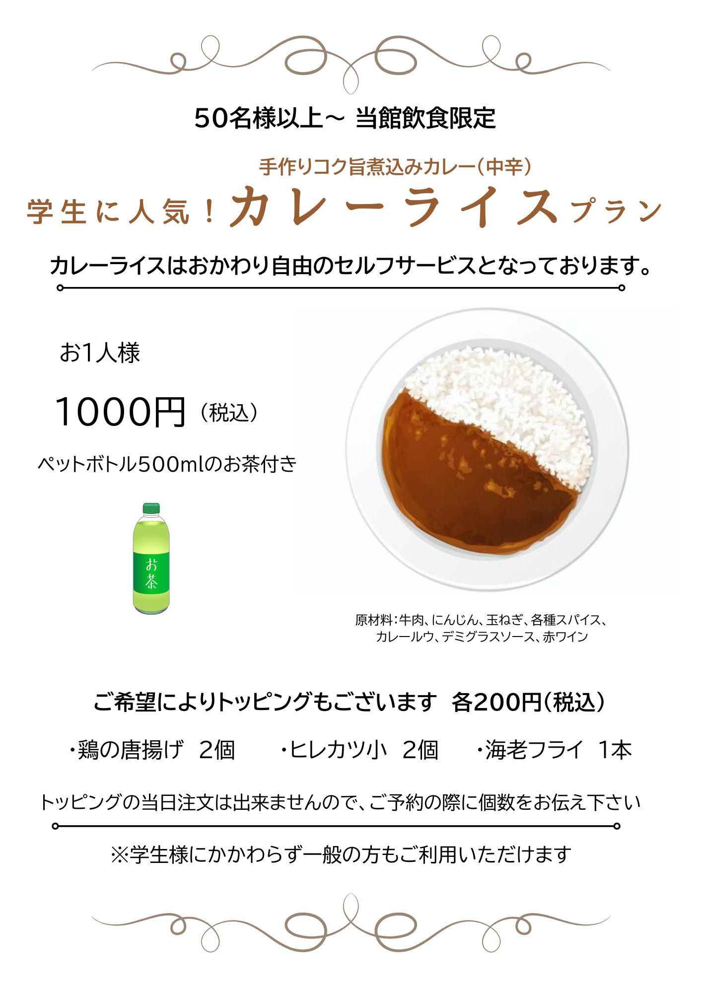 お知らせ 修学旅行などのお食事に 2026.01.07 by jyosui 0 修学旅行など団体様のお食事に、カレーライスプランを追加いたしました。 大人数で一堂に会しての昼食をおとりいただけます。駐車場は大型バスも複数台駐車いただけます。