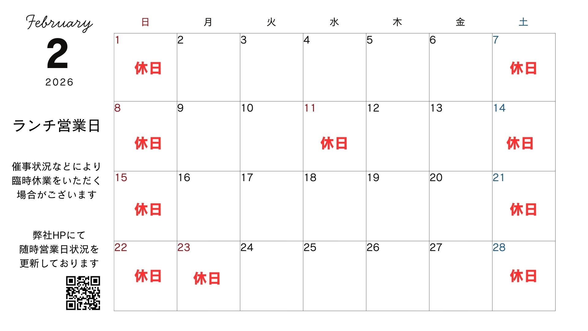 2026年2月ランチ営業日